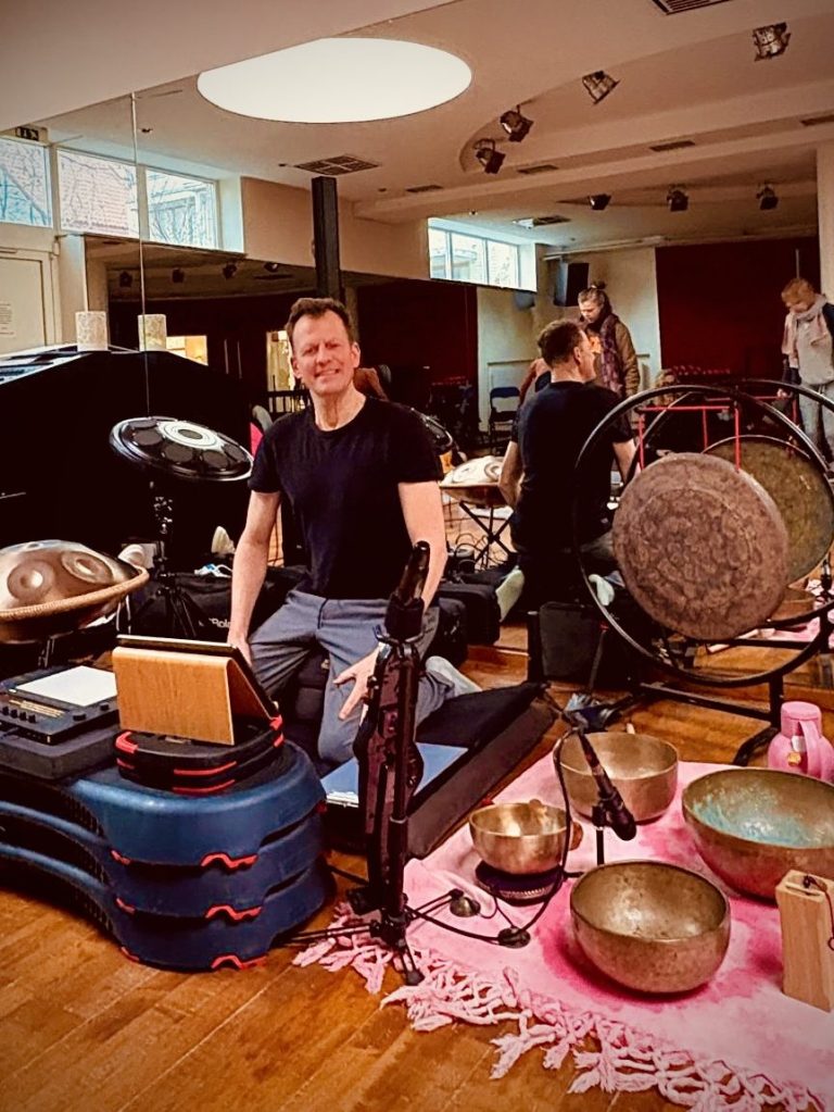 Alex spielt Klangschalen, Gong, Percussion. Ableton Push , Loopstation, Syntsax, Sopran-Sax und Handpan